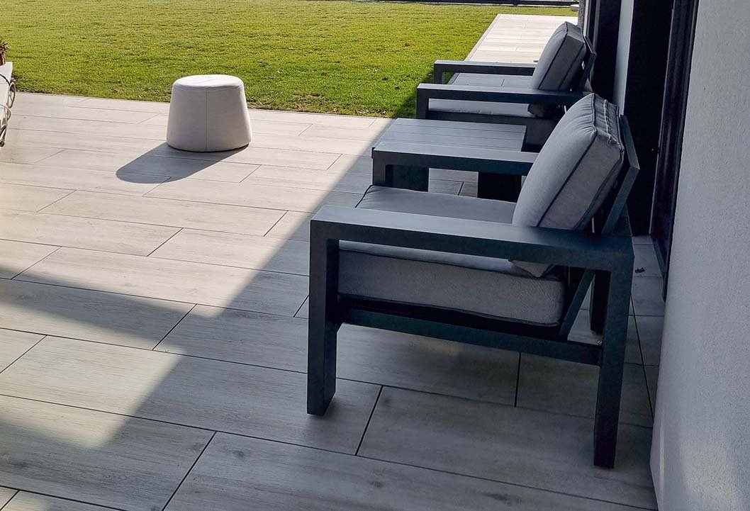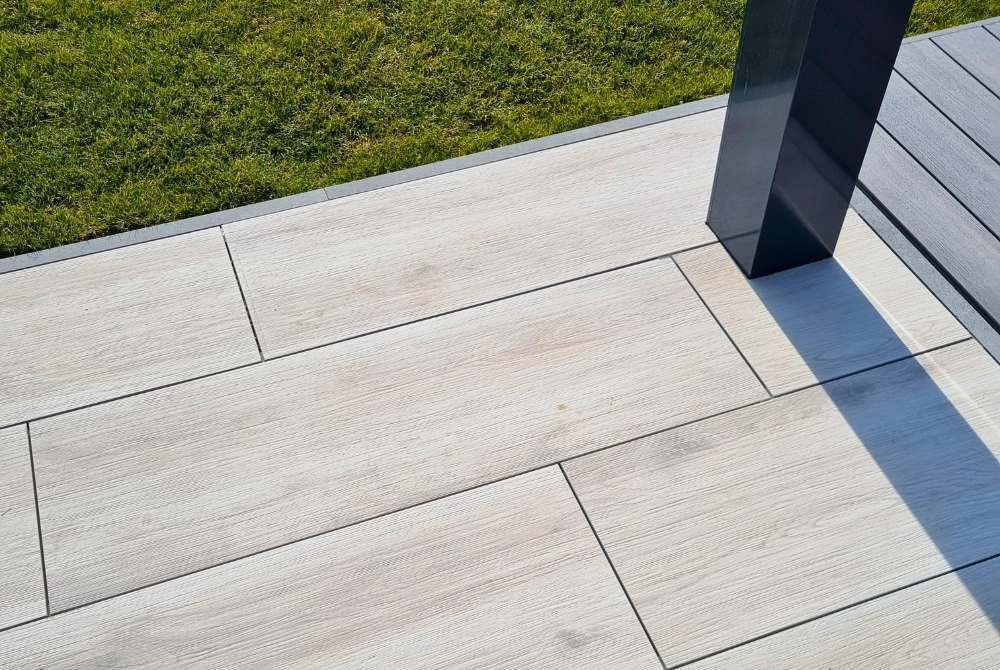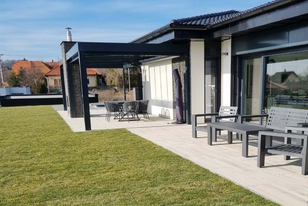 Terasa pod pergolou je řešena velkoformátovou dlažbou imitující dřevo ve světlých tónech (šedobéžová). Tato část slouží jako krytá relaxační zóna s posezením.