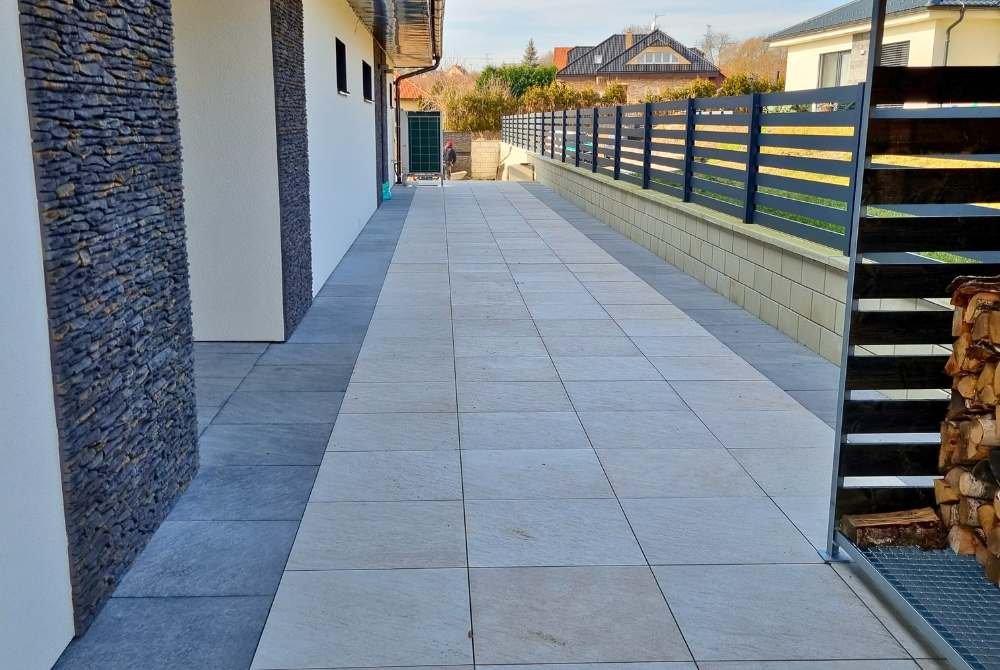 Exteriérová realizace s kontrastní dlažbou a terénními úpravami